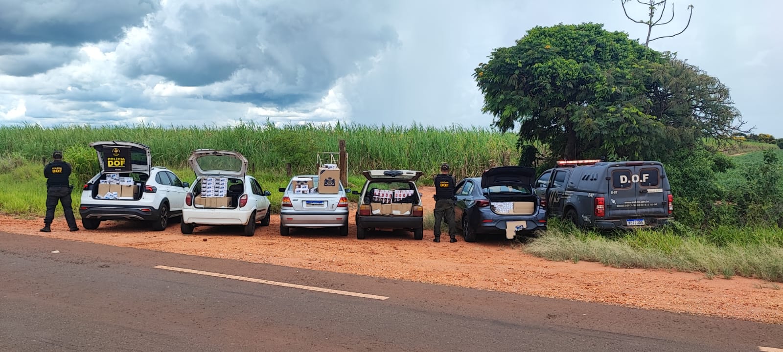 Foram apreendidos os seguintes veículos e respectivas cargas de cigarros: um VW Nivus branco conduzido por um homem de 40 anos, com 250 pacotes de cigarros; um GM Celta branco conduzido por um homem de 37 anos, com 225 pacotes de cigarros; um Fiat Siena prata conduzido por uma mulher de 34, tendo como passageira uma idosa de 63, com 225 pacotes de cigarros; um Chevrolet Onix cinza conduzido por uma mulher de 49 com uma criança de oito anos, com 225 pacotes de cigarros; e, um Fiat Uno cinza conduzido por uma mulher de 35, com 225 pacotes de cigarros.