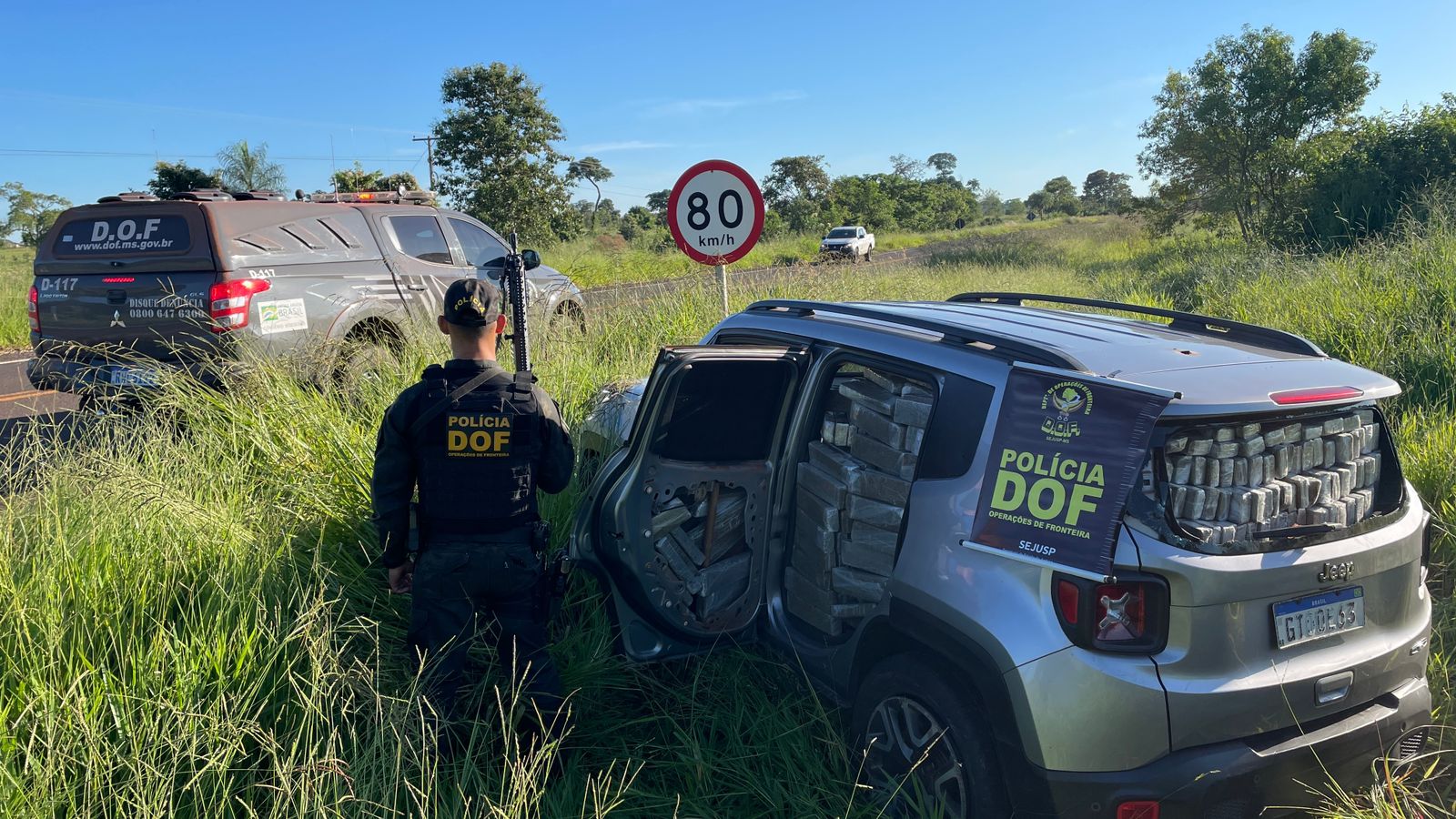 O DOF (Departamento de Operações de Fronteira) apreendeu nesta terça-feira (11/04) mais de 1,2 tonelada de maconha em um Jeep/Renegade, na MS-060, próximo ao distrito de Boqueirão em Jardim. Um homem de 22 anos, de que conduzia o veículo, foi preso em flagrante.