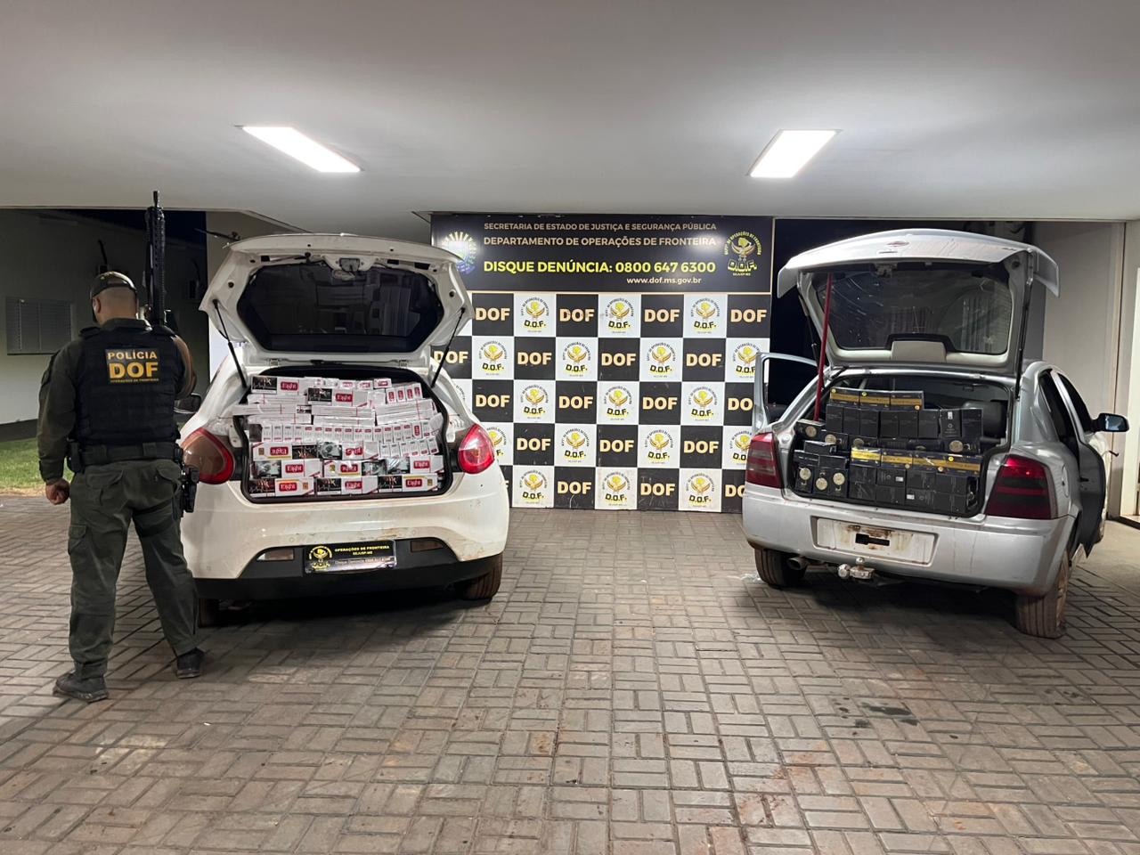 Policiais militares do DOF (Departamento de Operações de Fronteira) apreenderam neste sábado (11), em Rio Brilhante, dois carros carregados com 2 mil pacotes de cigarros contrabandeados do Paraguai. Os automóveis – um Fiat Bravo e um GM Astra – estavam completamente abarrotados com a carga ilegal.