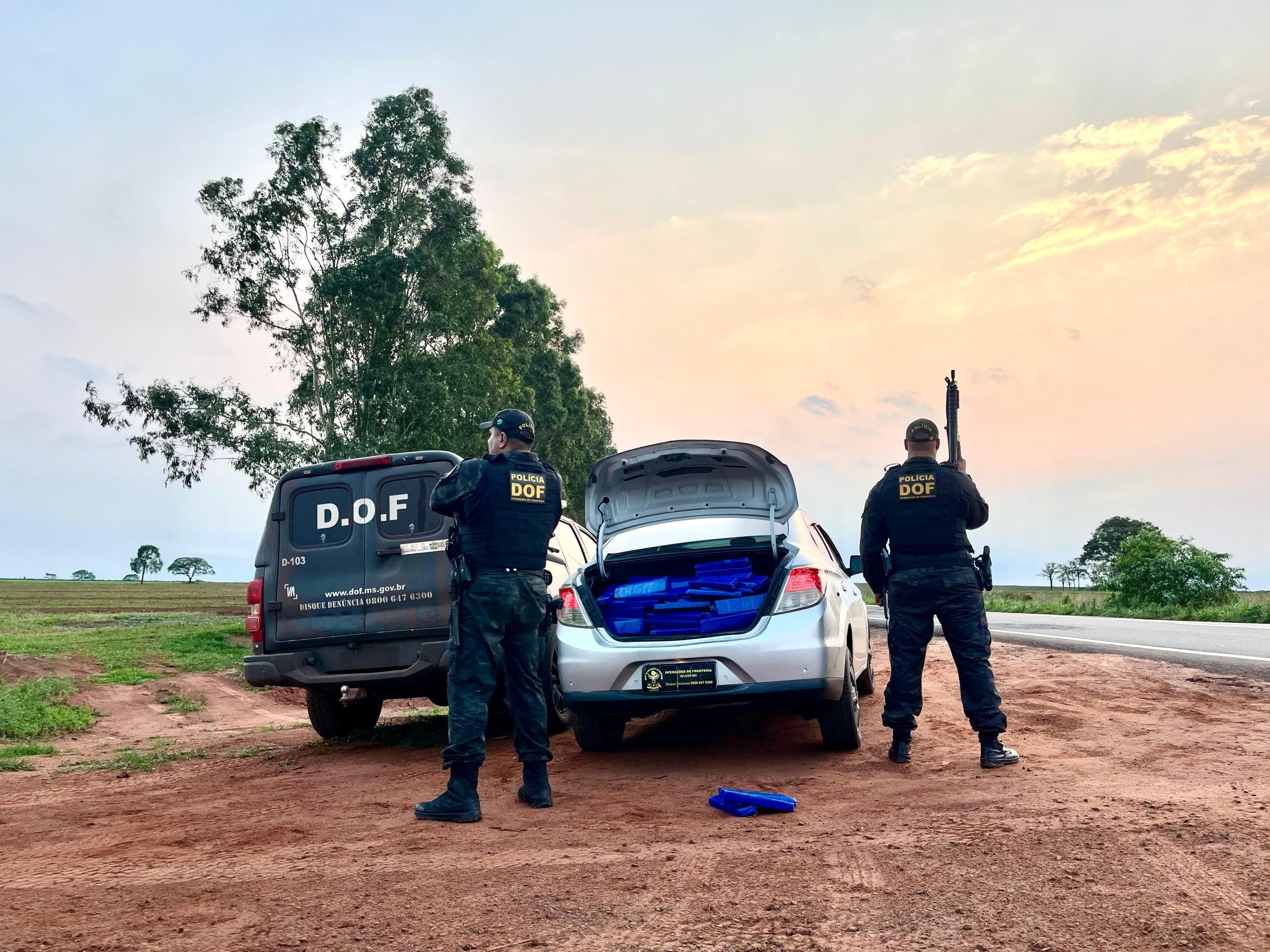 Policiais militares do DOF (Departamento de Operações de Fronteira) apreenderam, neste domingo (12), na MS-295, em Tacuru, 412 quilos de maconha que eram transportados em um veículo GM Prisma. Um homem de 23 anos foi preso em flagrante.